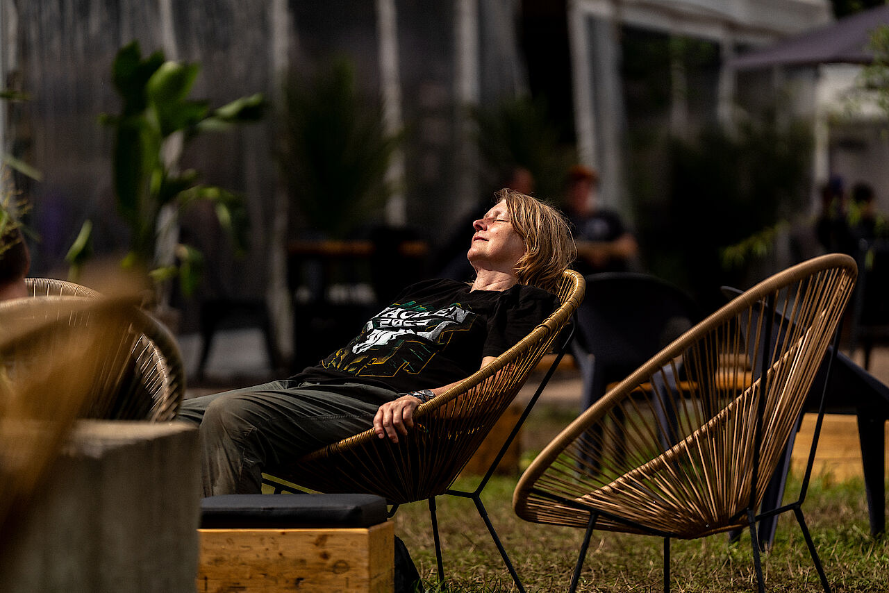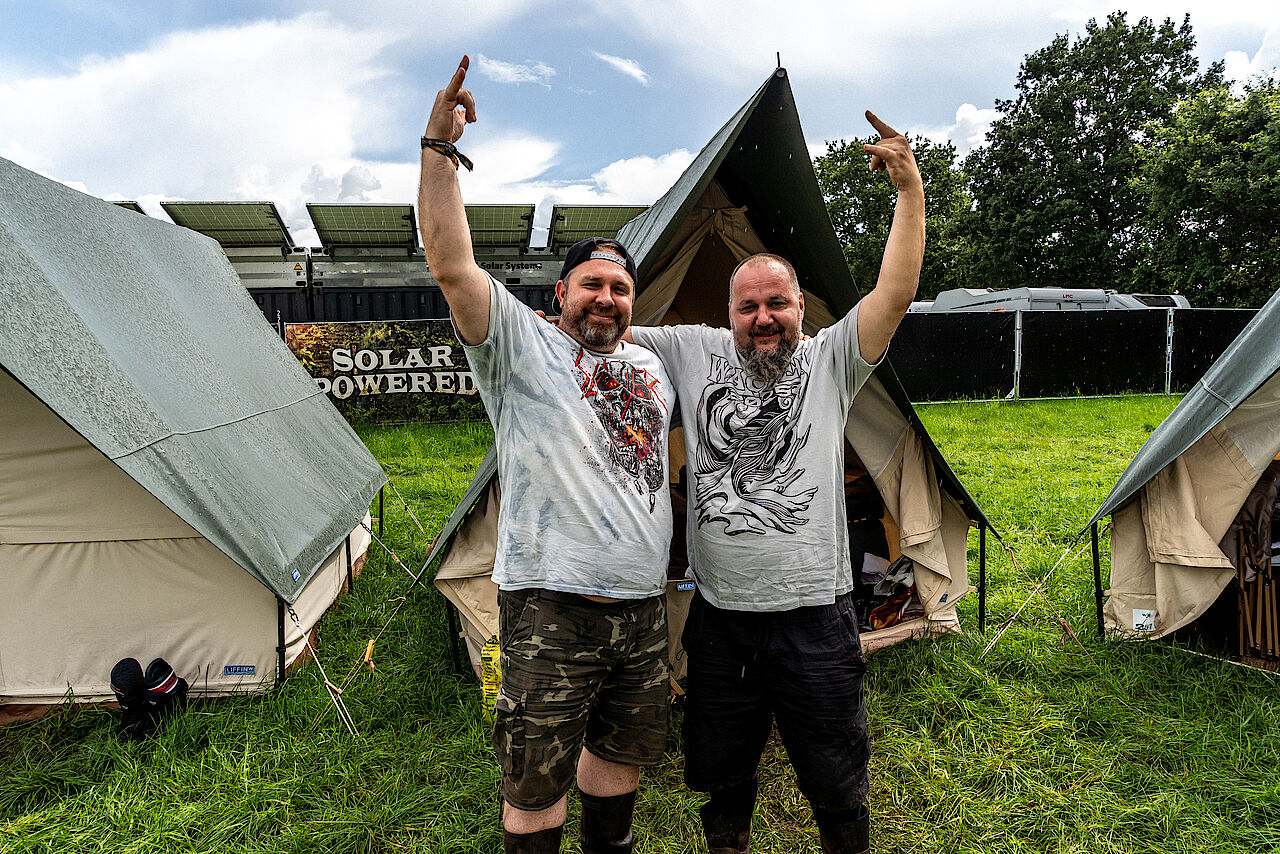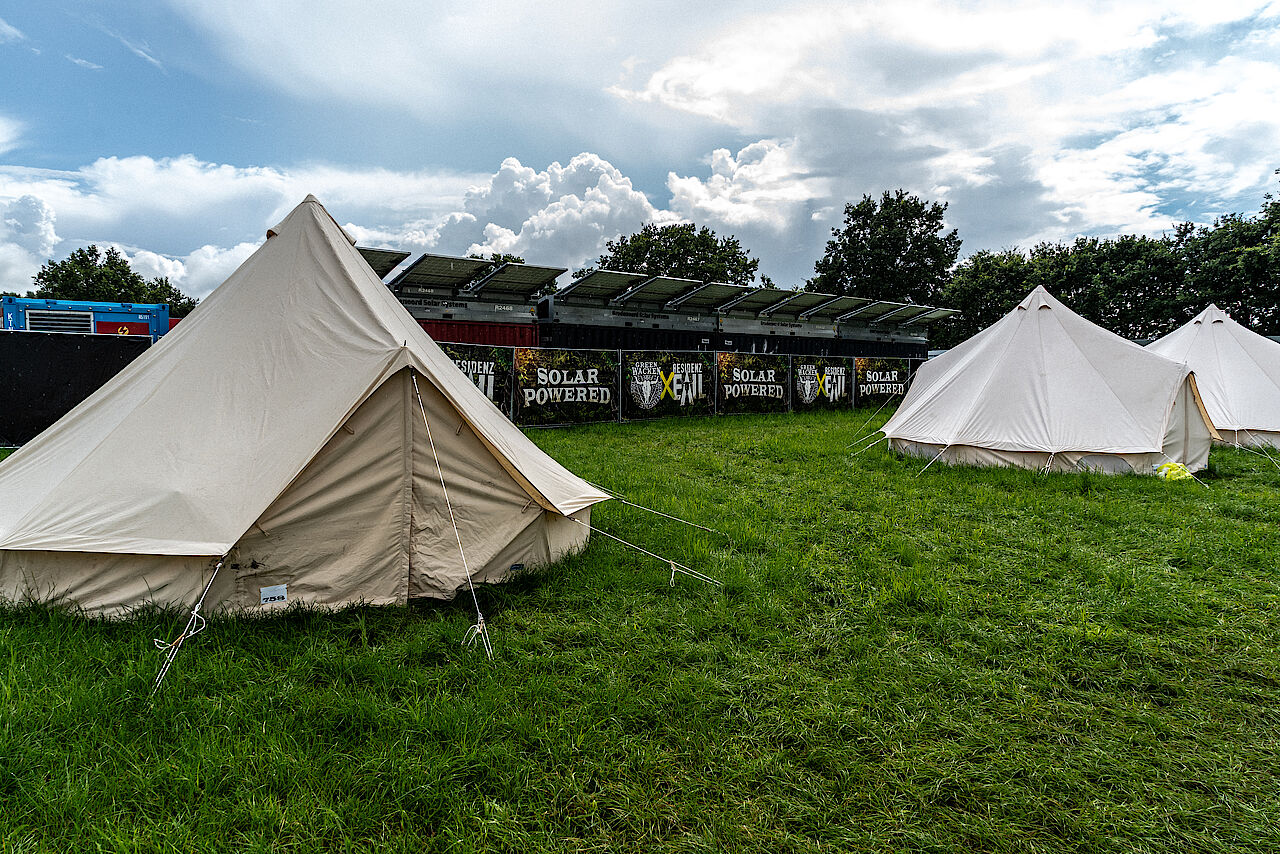 Geht auch! Das Temple-Zelt bietet euch zunächst einmal eine komfortable Grundfläche von ca. 2,50 x 3 Metern und eine Höhe von ca. 2,20 Metern. Sollte also klappen, wenn ihr euch im Stehen strecken wollt. Aber das Beste: In der hinteren Zeltwand könnt ihr ein Fenster öffnen! Gerade an heißen Wacken-Tagen ist das Gold wert.