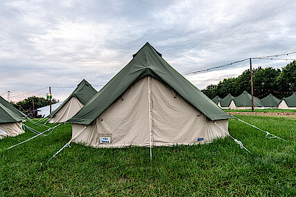 Beim Cathedral-Zelt ist der Name Programm: ca. 6 x 4 Meter Grundfläche, ca. 3 Meter Höhe. Sechs Metalheads finden hier locker Platz, und durch die zwei Mittelpfosten kann der Raum auch effektiv genutzt werden. Die Betten und Ausstattungen sind genauso wie in den Kategorien zuvor.