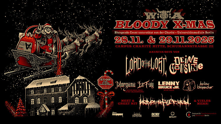 Organisiert in Zusammenarbeit mit dem Zentrum für Transfusionsmedizin und Zelltherapie (ZTB) der Charité, bietet der Bloody X-Mas Markt eine einzigartige Kombination aus Blutspendeaktion, Live-Musik und Meet & Greets in weihnachtlicher Atmosphäre.