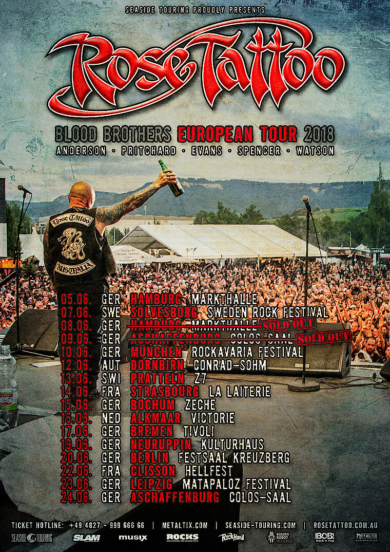 Rose Tattoo feiern das Jubiläum von "Blood Brothers" - und alle feiern mit! Auf die ausverkaufte Show in Aschaffenburg folgte eine Zusatzshow, nun ist auch Hamburg ausverkauft. Doch keine Sorge: Auch hier wird es einen weiteren Termin geben!