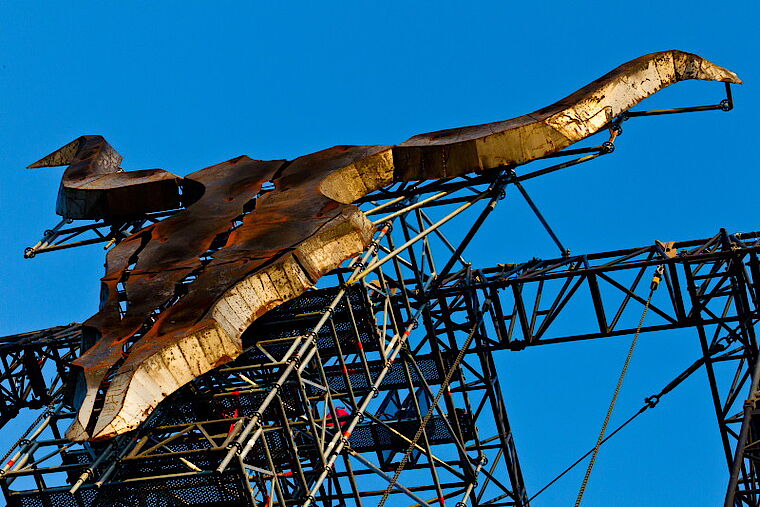 Die Eckdaten: 2,5 Tonnen schwer, 12,5 Meter breit, 10 Meter hoch. Natürlich darf auch beim neuen Schädel beim Feuer nicht gespart werden: Aus bis zu 40 Öffnungen können nun die Flammen schießen.