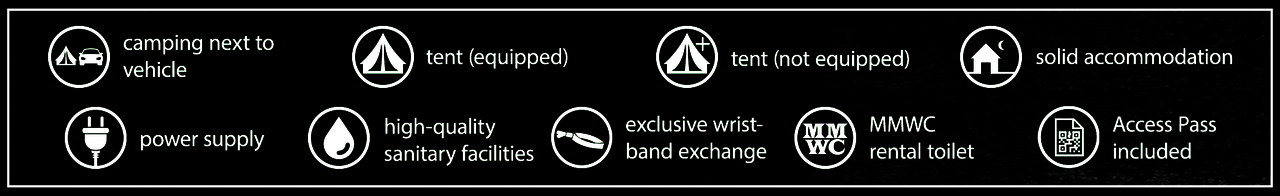 Want more? You got it! Here, you’ll find comfy beds, power supply in all tents, a lounge with food & beverage area, high-quality sanitary facilities with showers and water-flushed toilets and a exclusive welcome gift.
